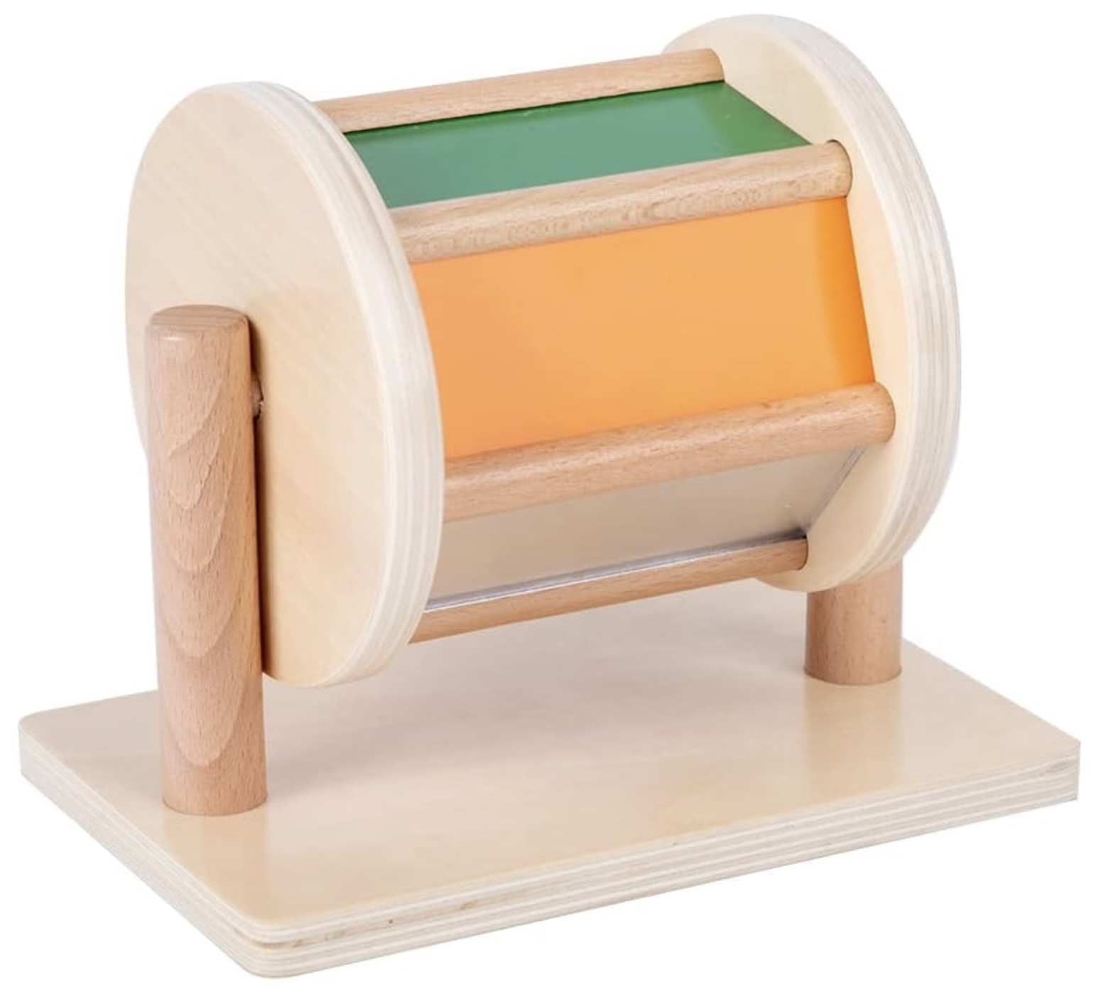 Our baby loved playing with a colorful rainbow spinner. A marble inside makes a loud, hollow sound when it's spun. We love that the rhythm of the sound depends on how fast baby spins it, providing auditory feedback in response to baby's actions. And a spinner looks beautiful on your toy shelf.